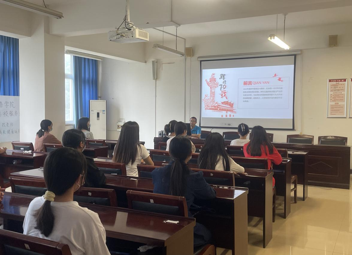 9月19日下午,公司党总支书记郭强在A10-205会议室以“新中国史-辉煌73载”为主题,为21级应用英语专业1班全体员工讲授思政课。