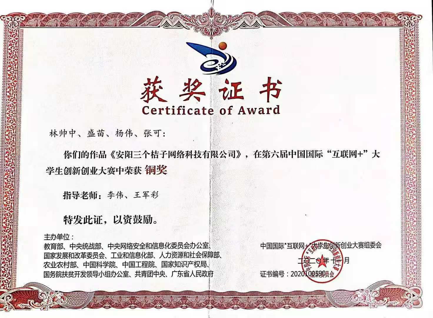 第六届中国国际“互联网+”老员工创新创业大赛获奖证书